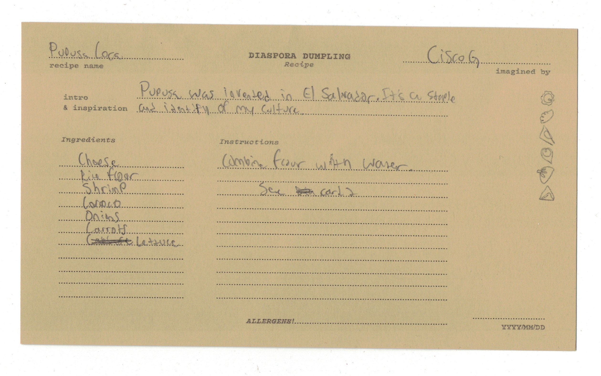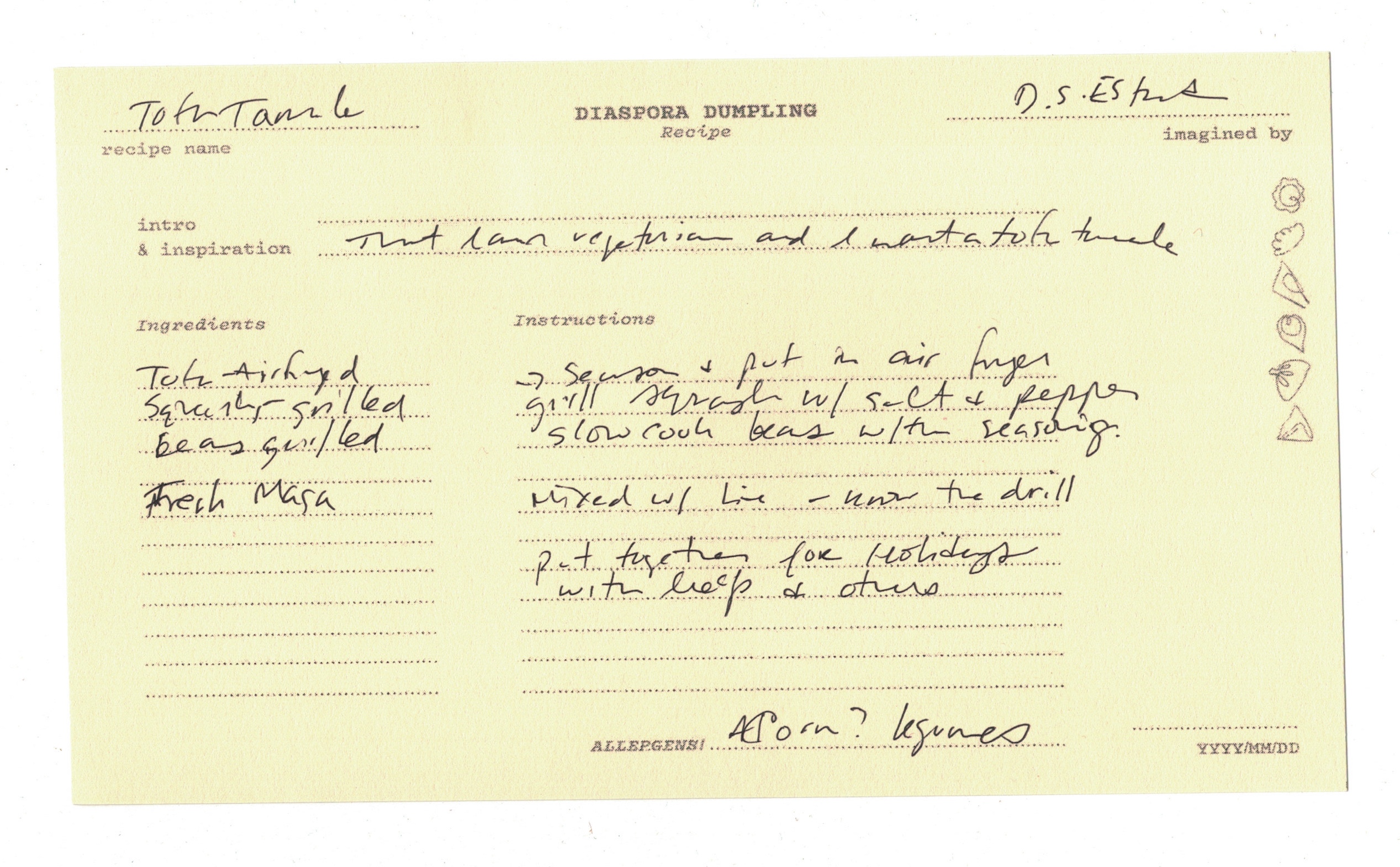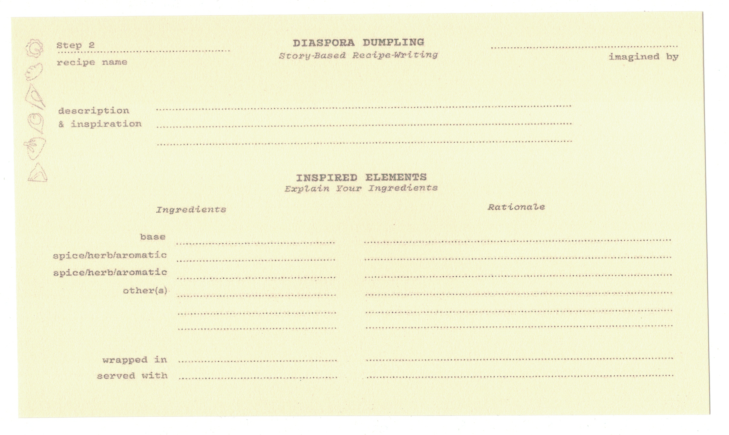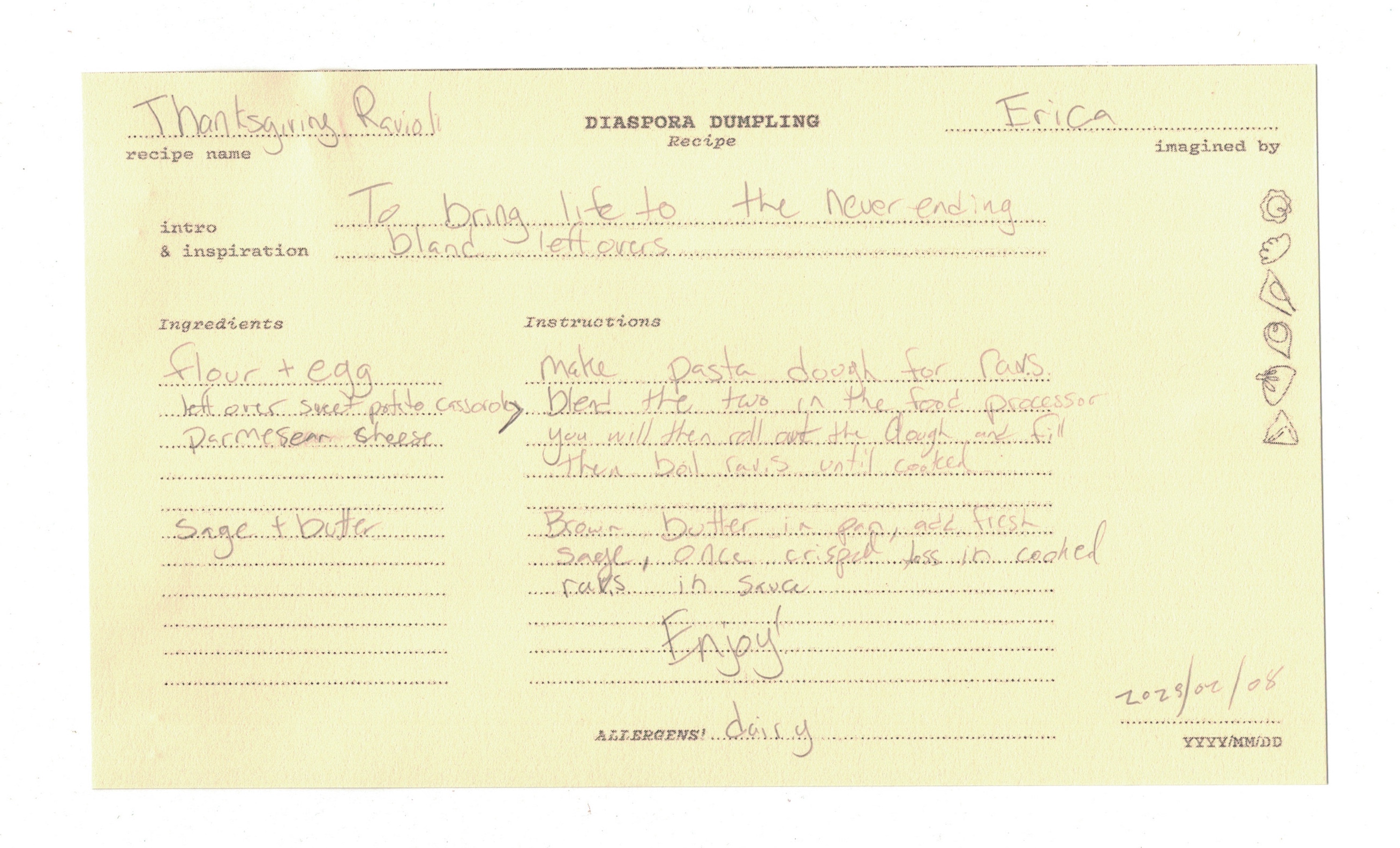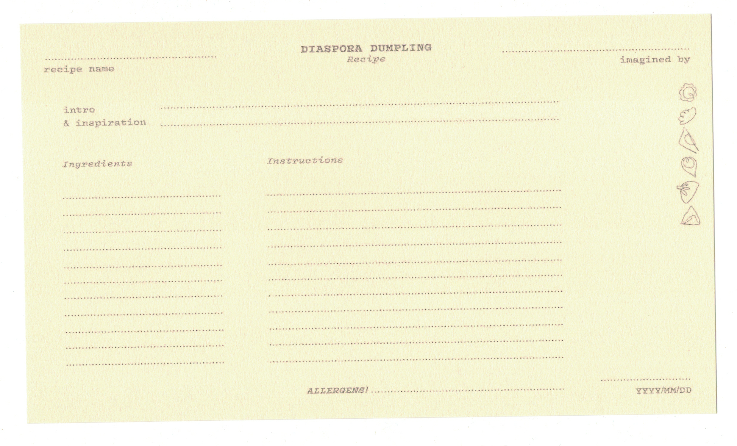 The first additions to the above recipe card collection originate from the Diaspora Dumplings Potluck + Archiving Party, where eight participants shared the edible results of their exploration of the richness of food as medium.