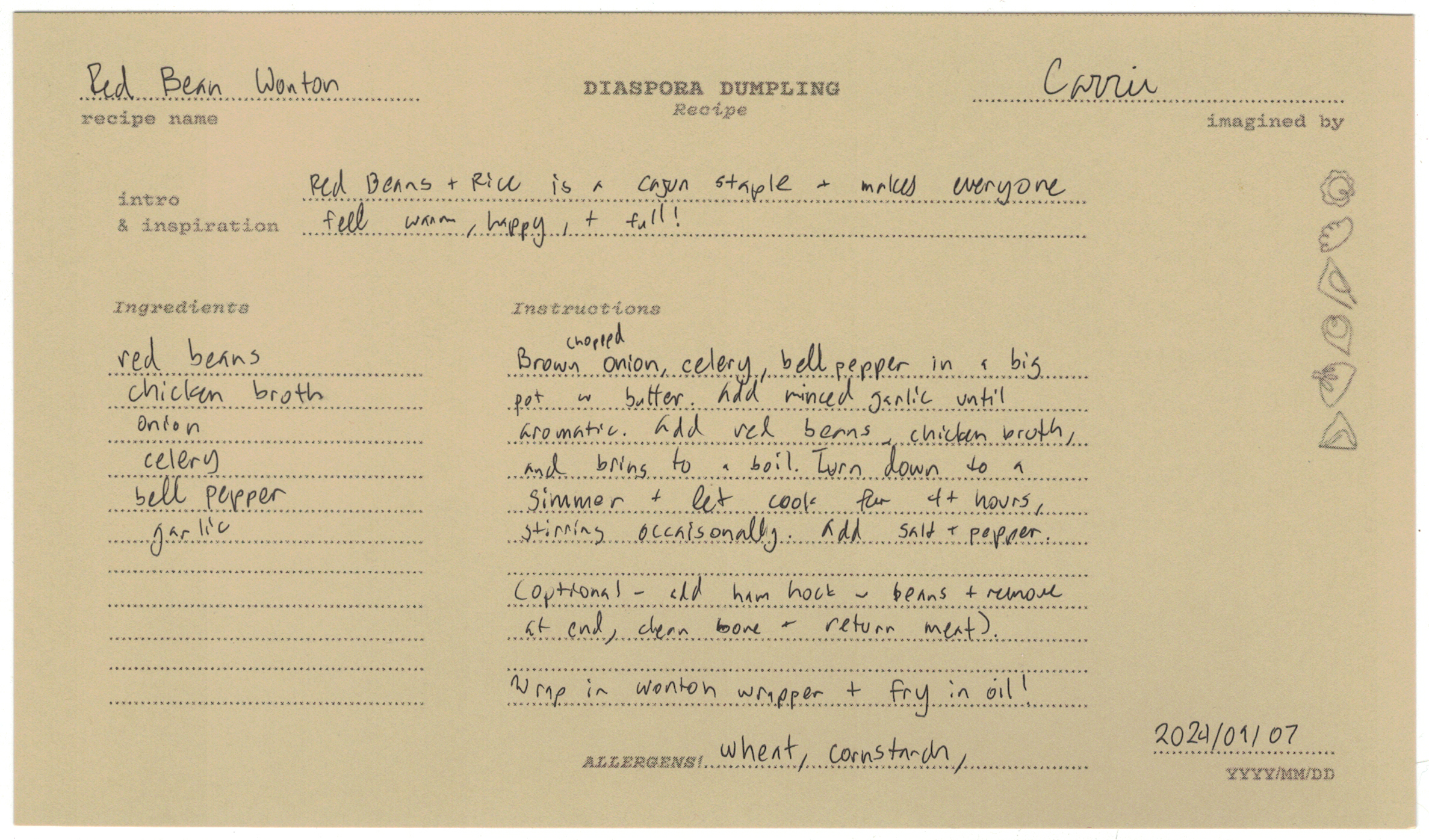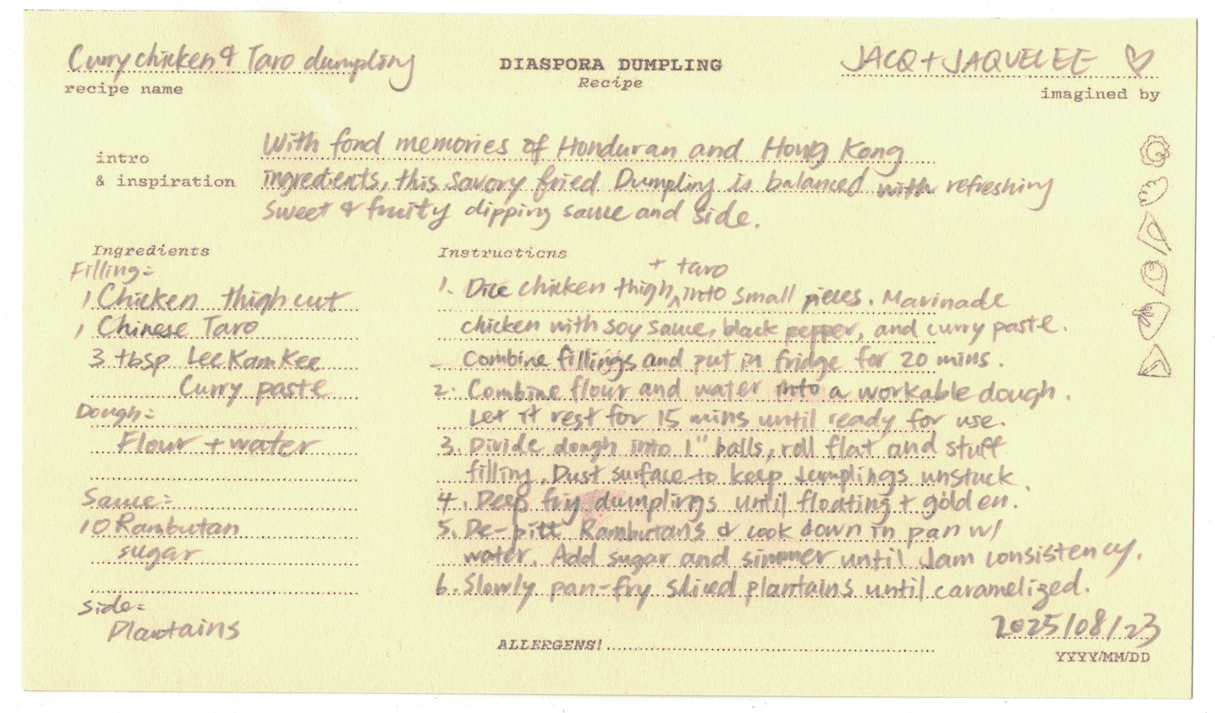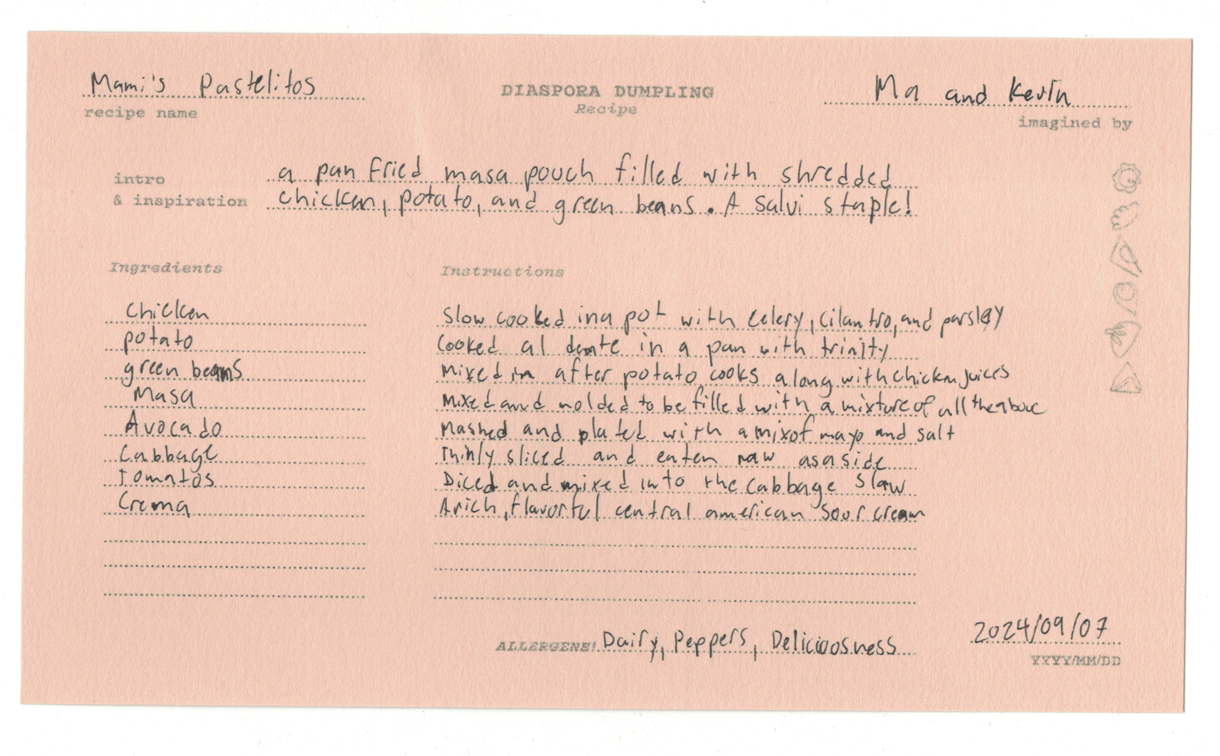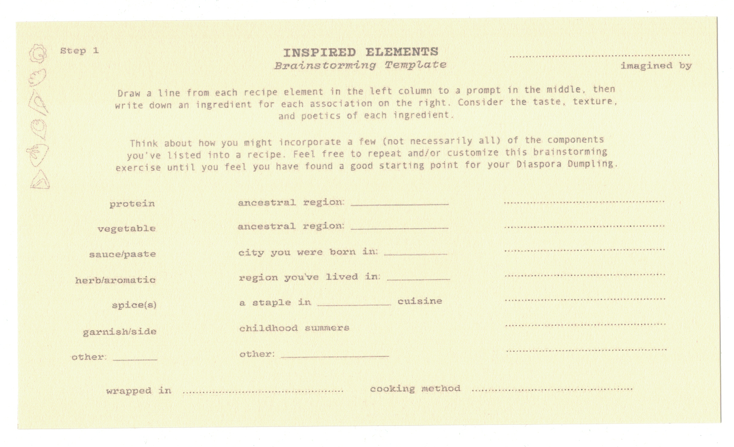 The first additions to the above recipe card collection originate from the Diaspora Dumplings Potluck + Archiving Party, where eight participants shared the edible results of their exploration of the richness of food as medium.