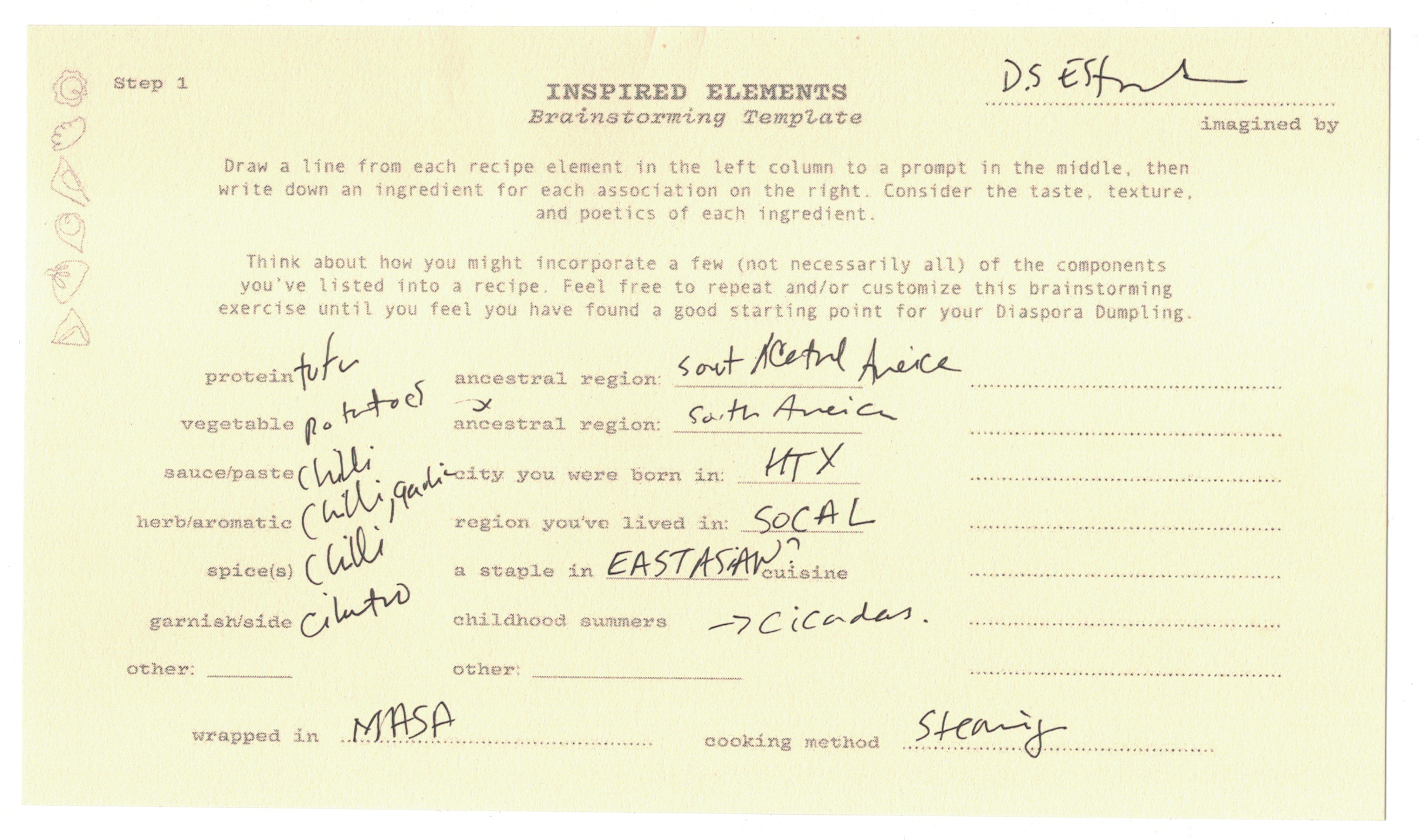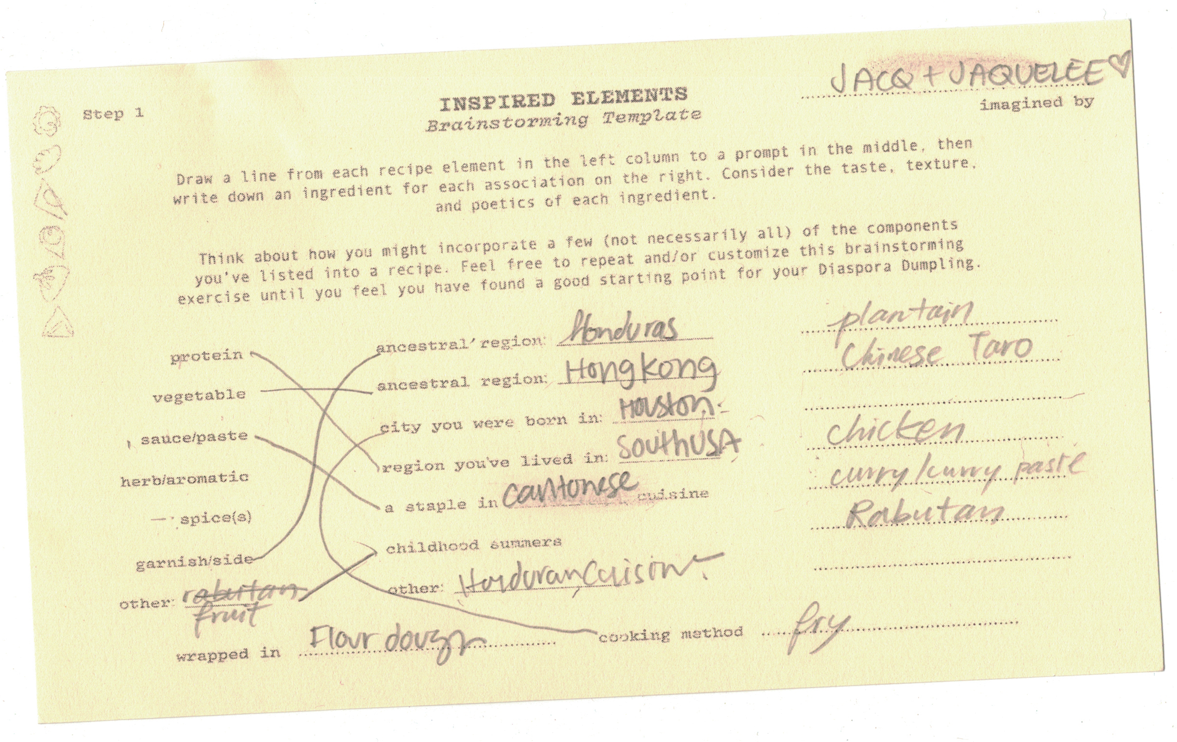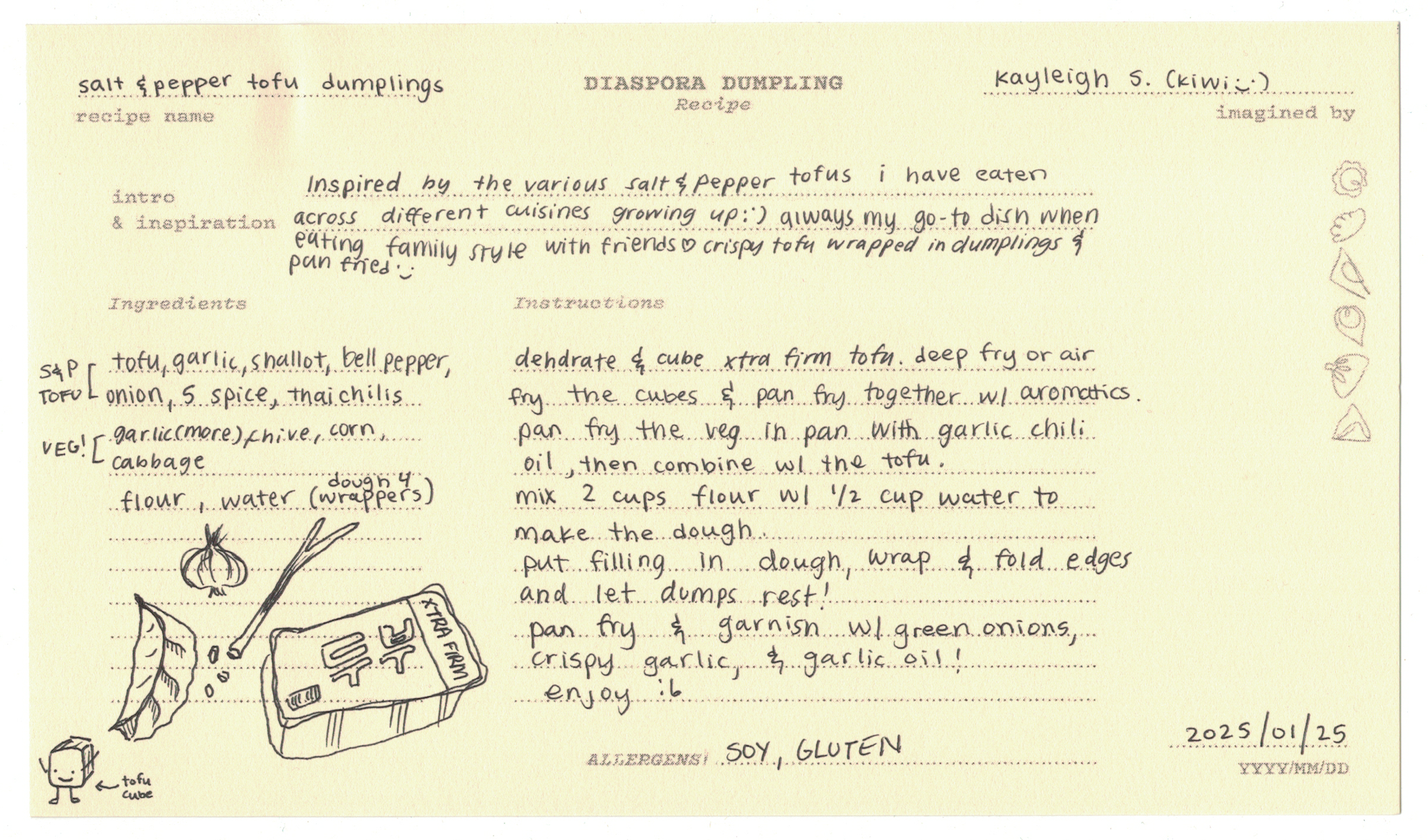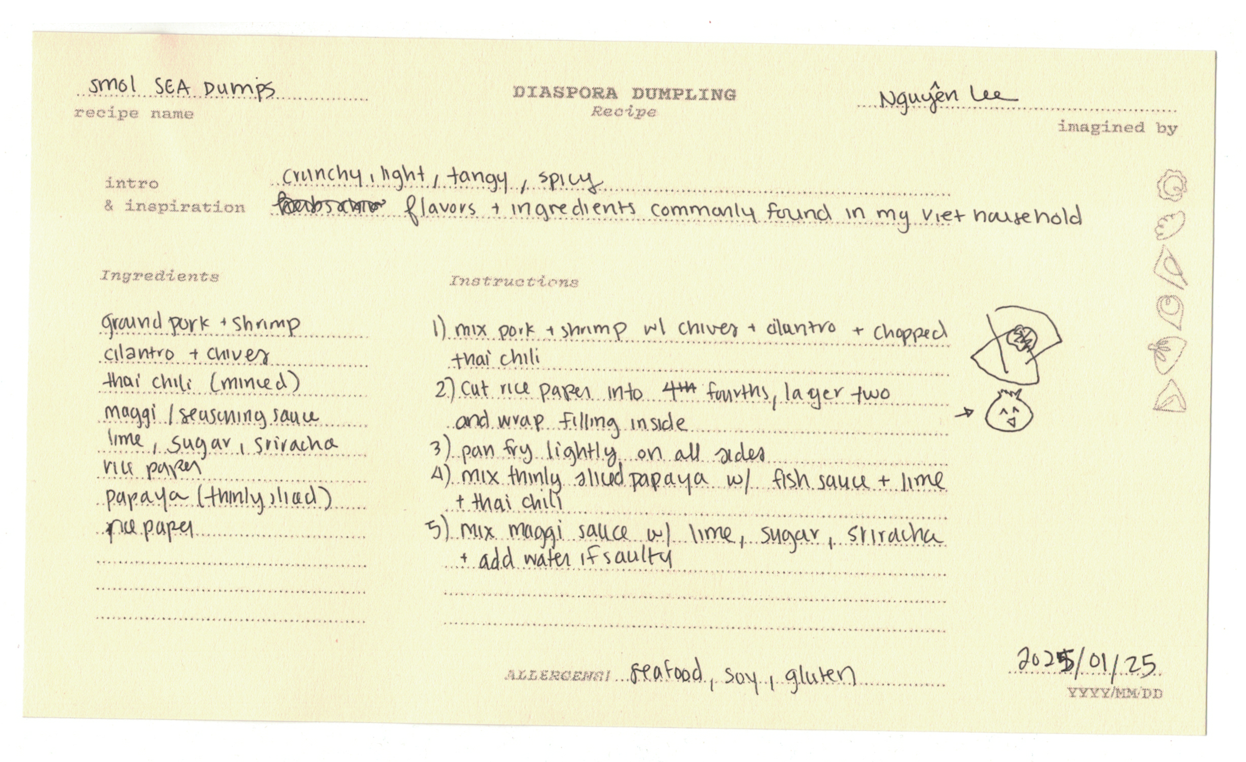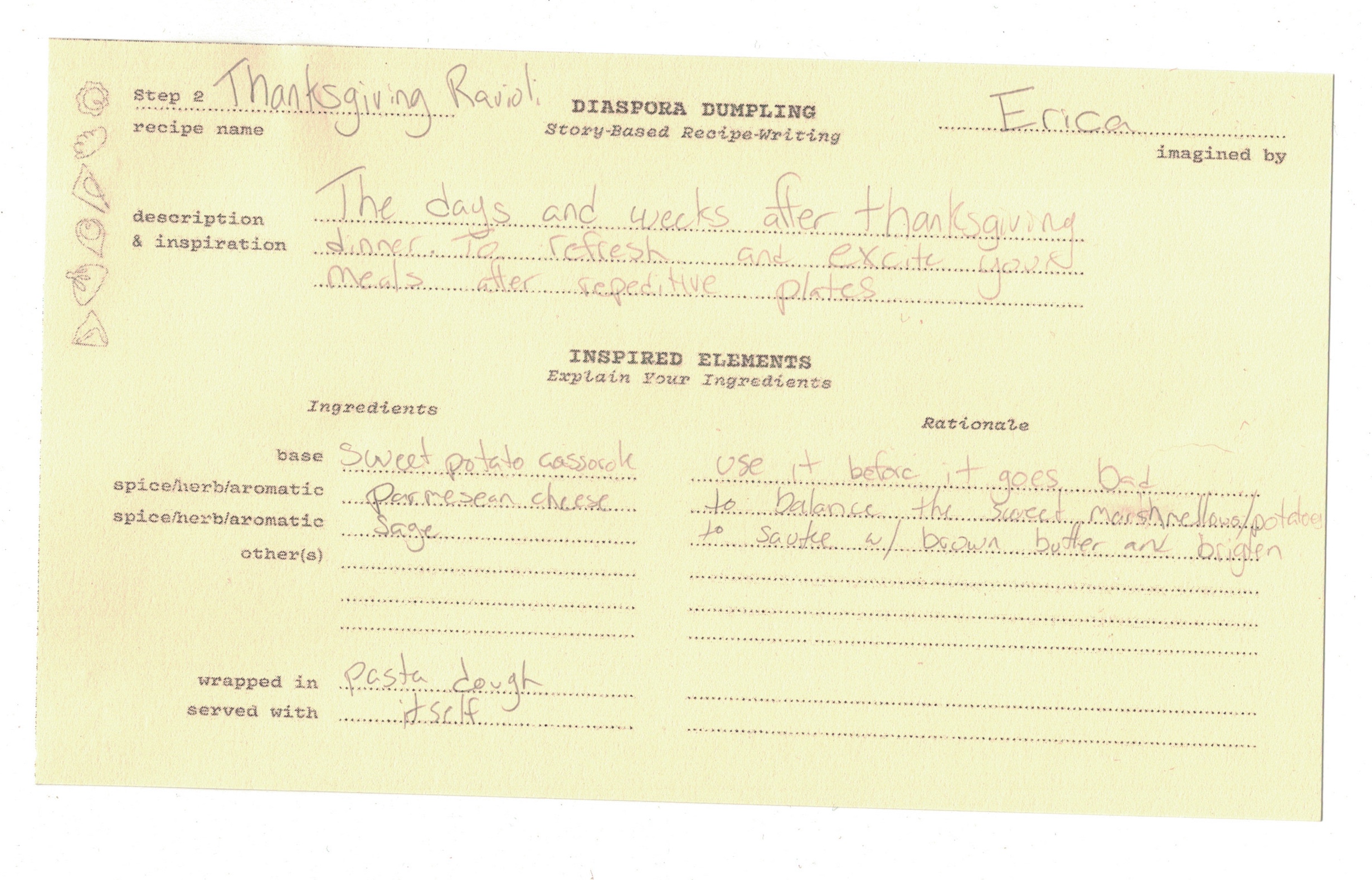 The first additions to the above recipe card collection originate from the Diaspora Dumplings Potluck + Archiving Party, where eight participants shared the edible results of their exploration of the richness of food as medium.