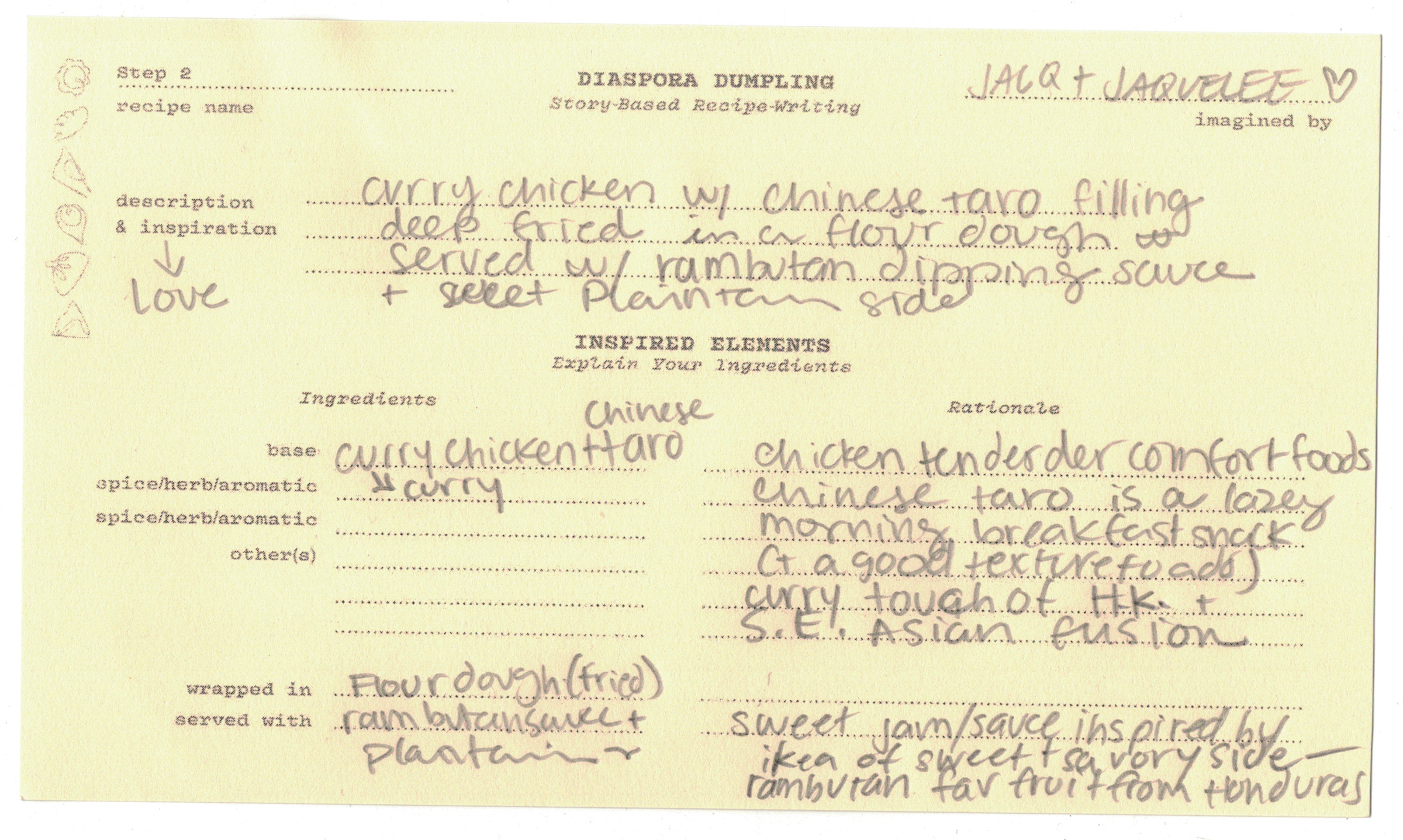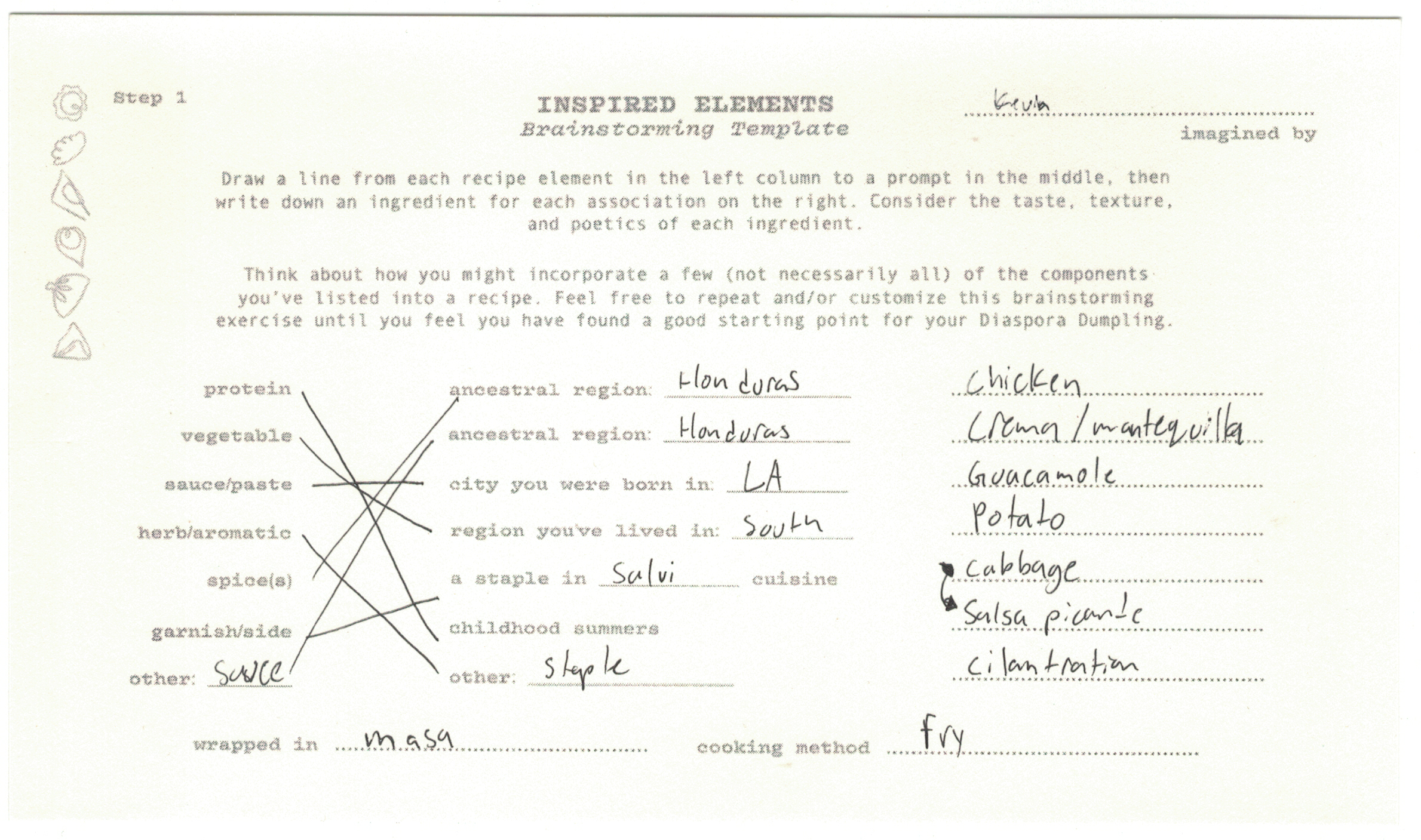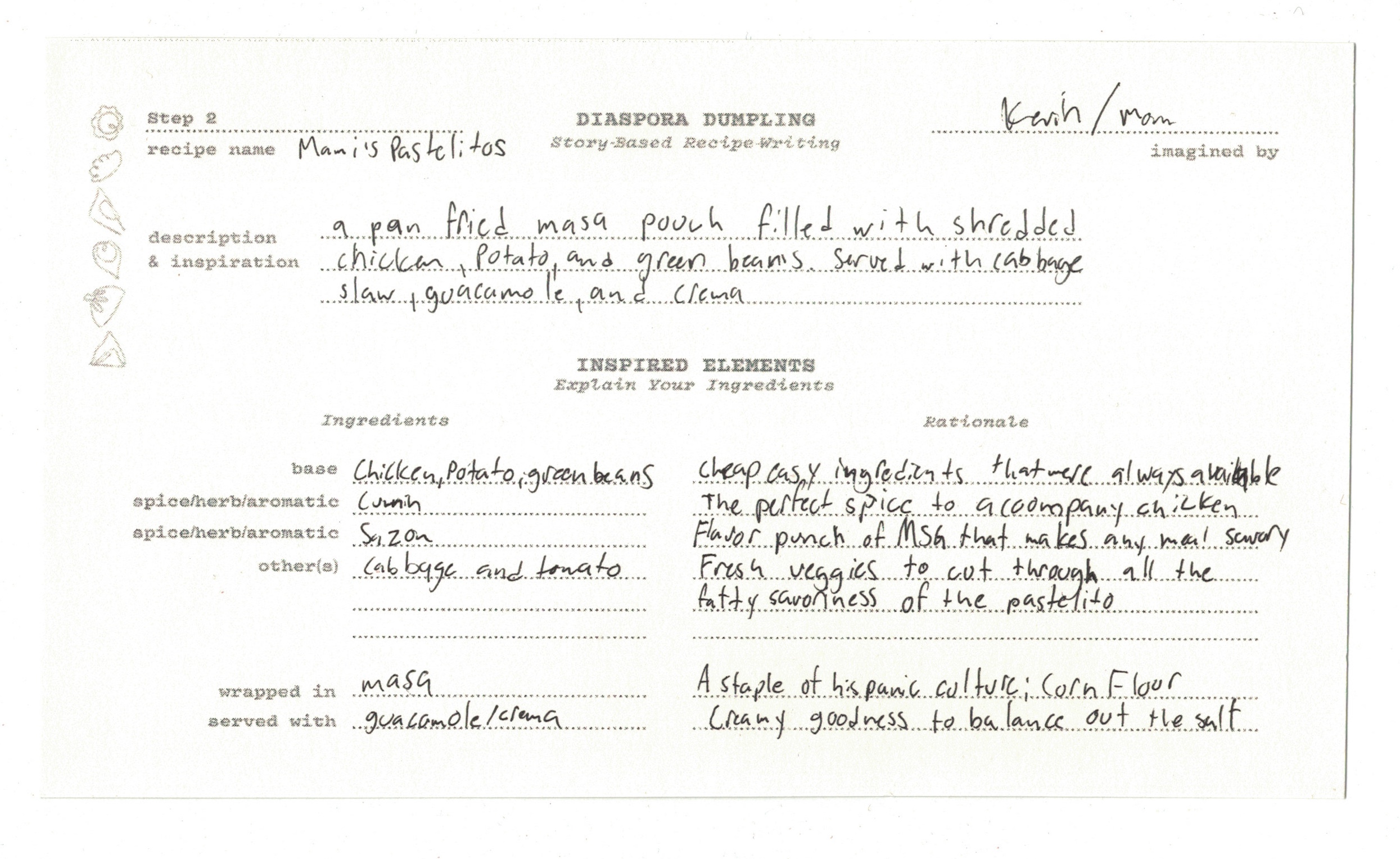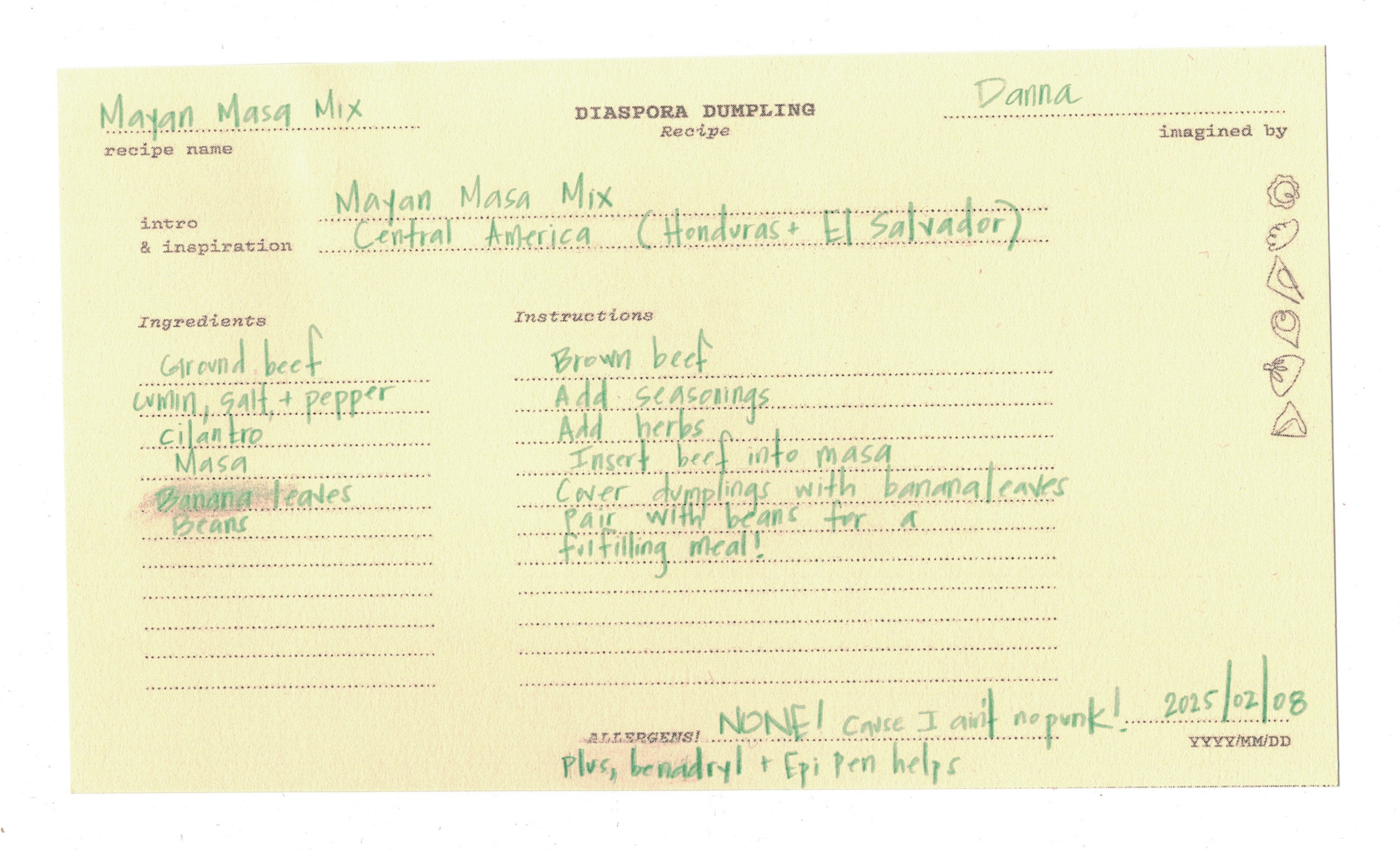 The first additions to the above recipe card collection originate from the Diaspora Dumplings Potluck + Archiving Party, where eight participants shared the edible results of their exploration of the richness of food as medium.
