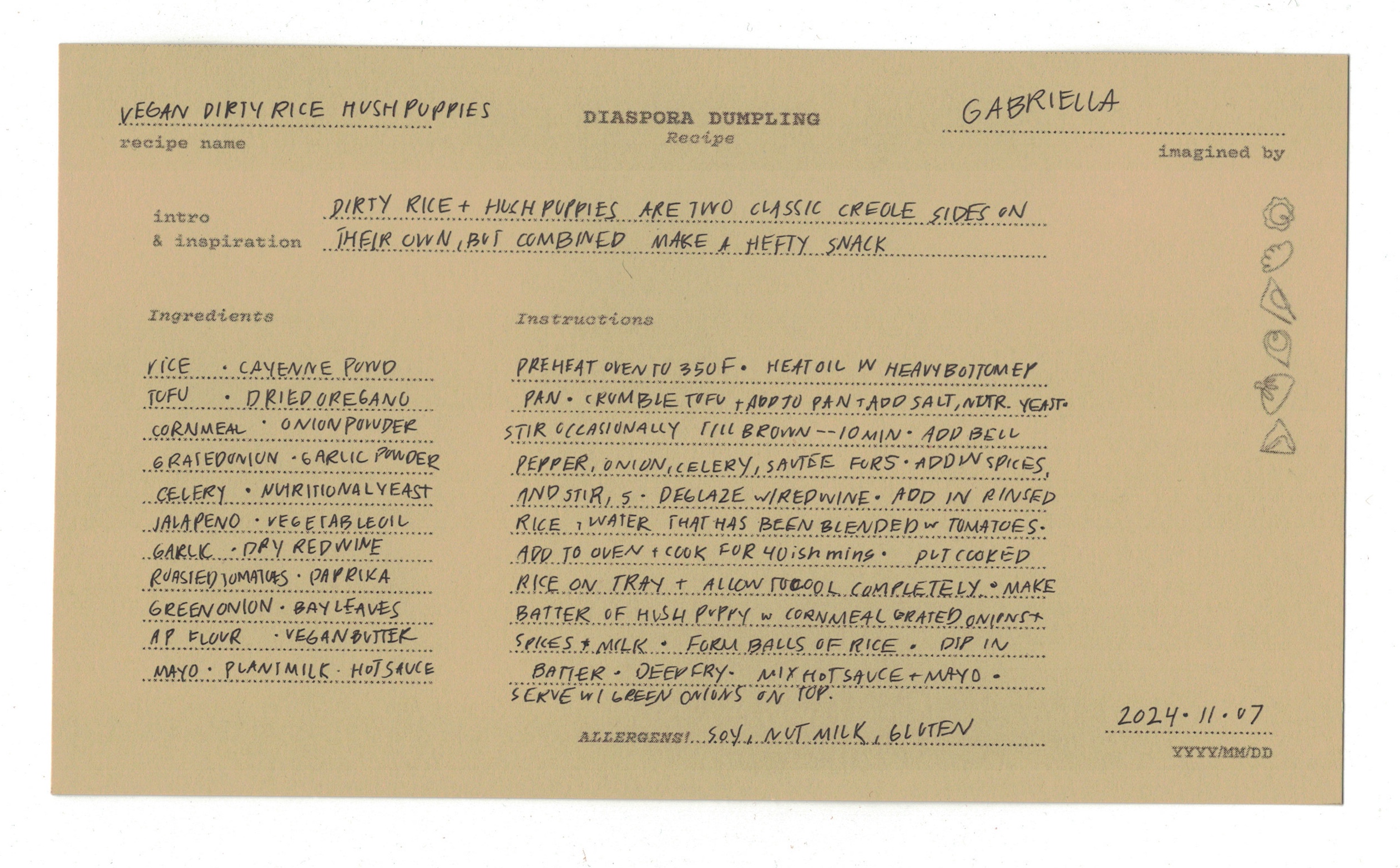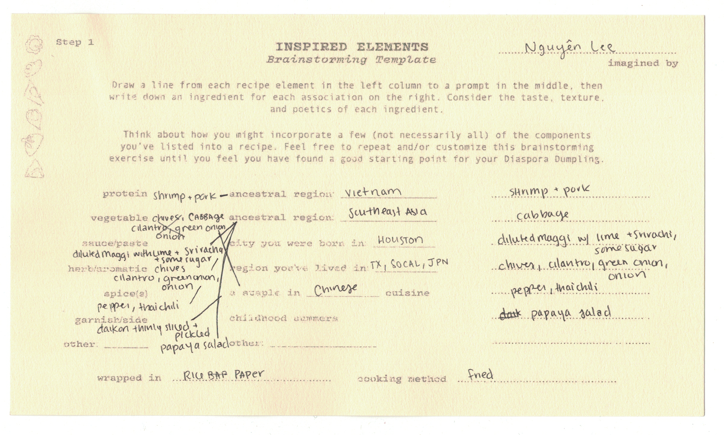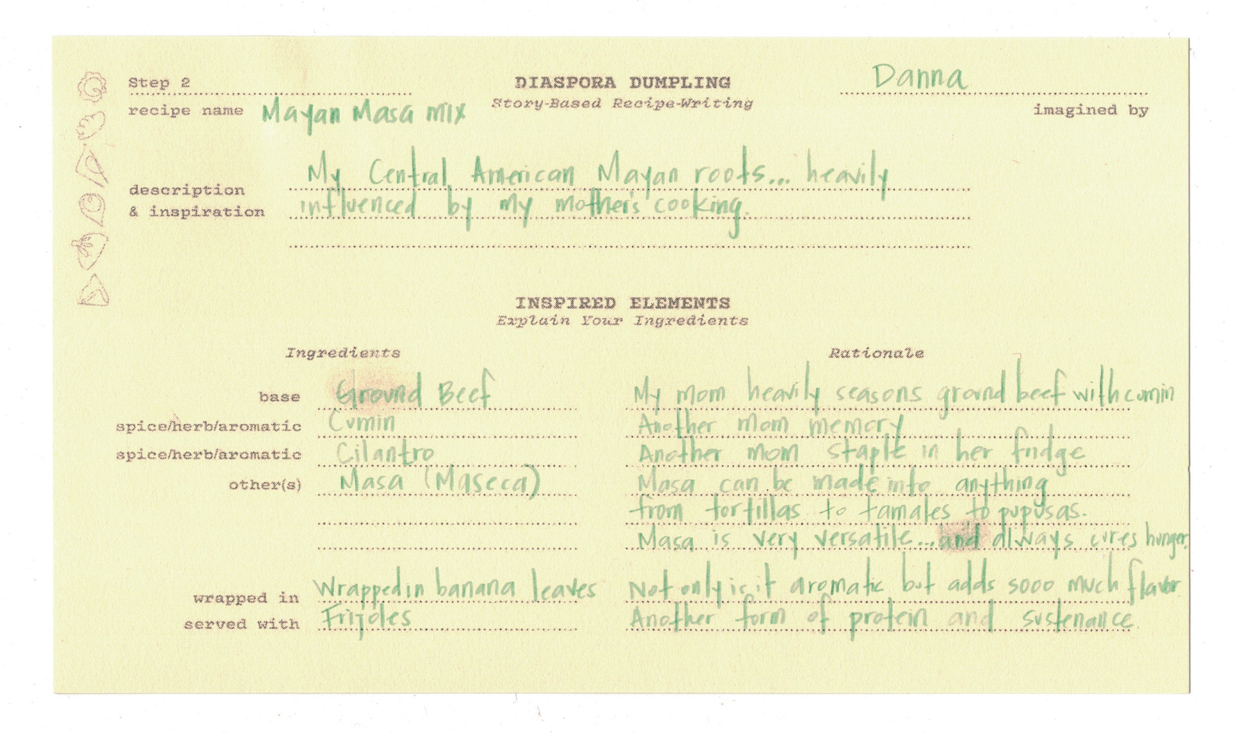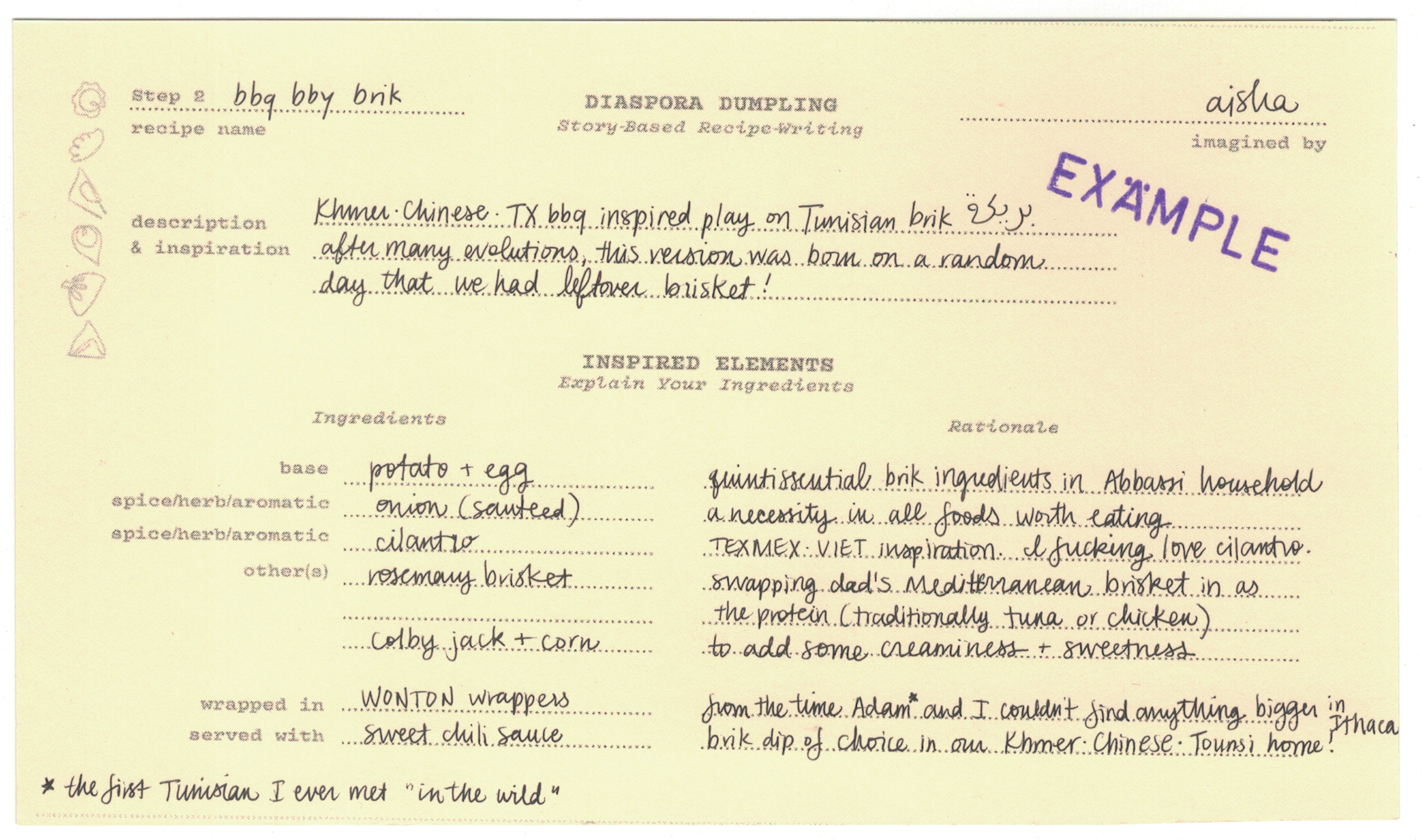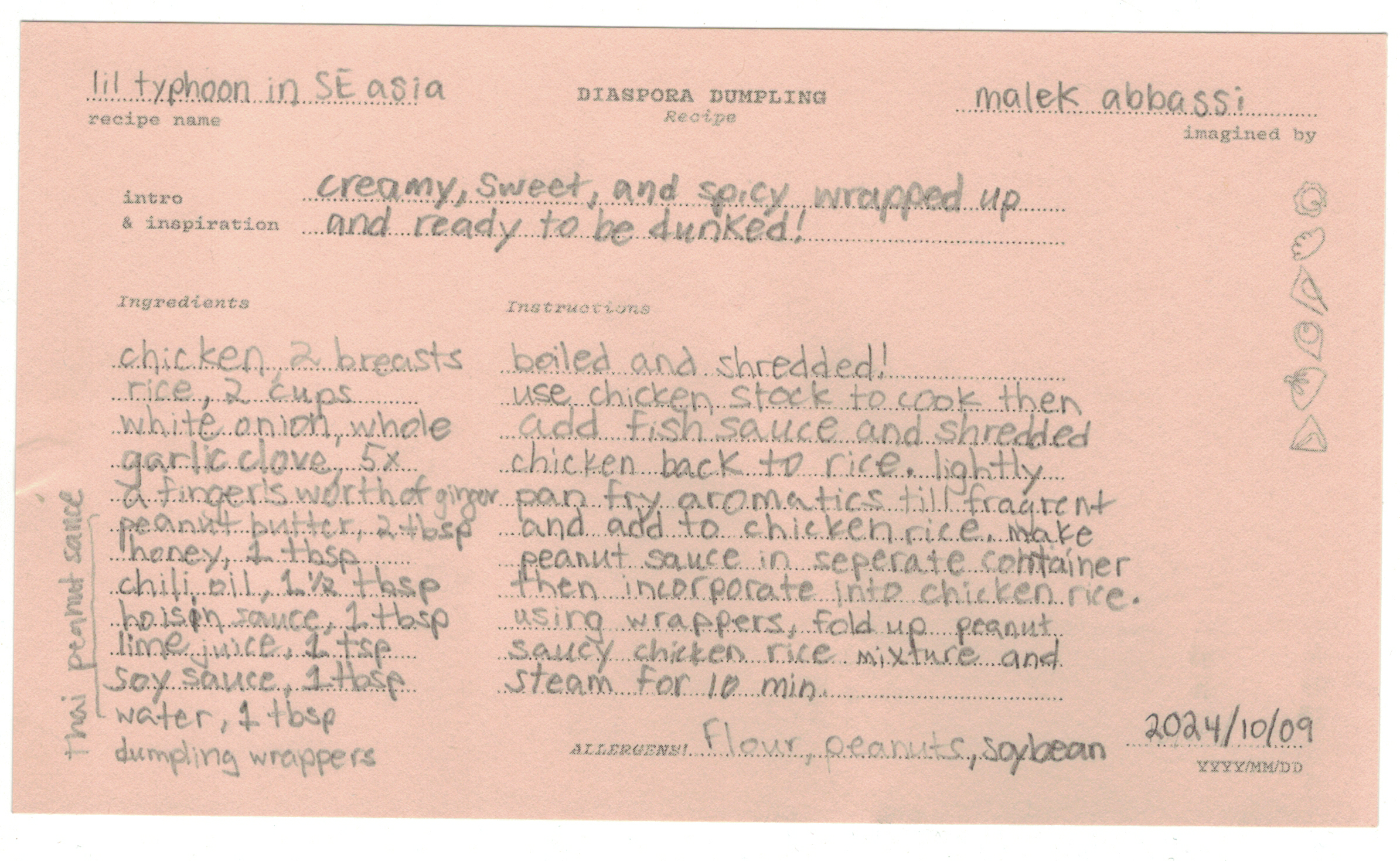 The first additions to the above recipe card collection originate from the Diaspora Dumplings Potluck + Archiving Party, where eight participants shared the edible results of their exploration of the richness of food as medium.