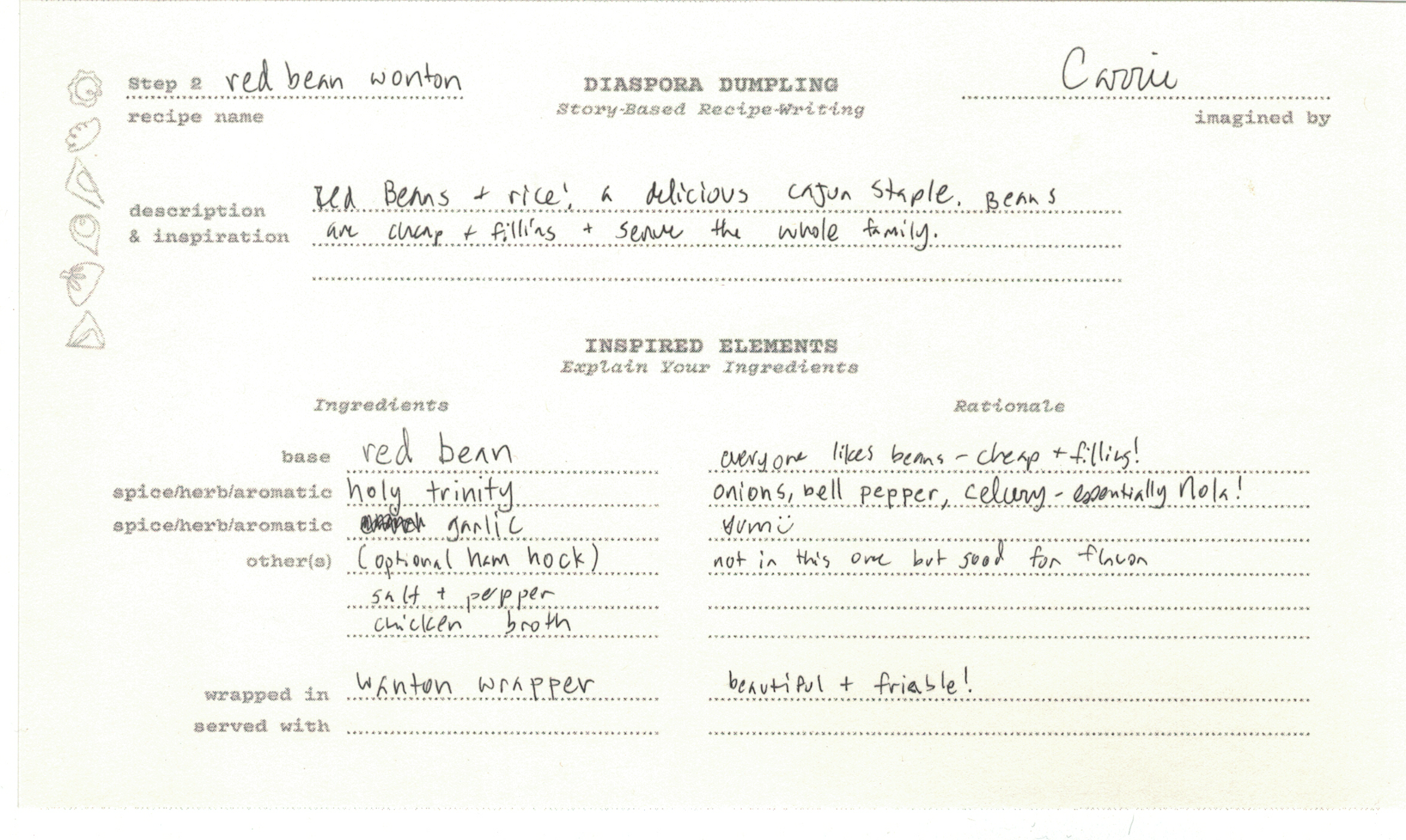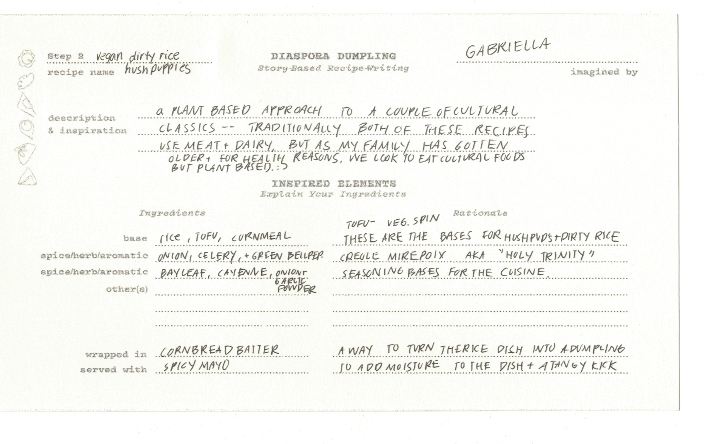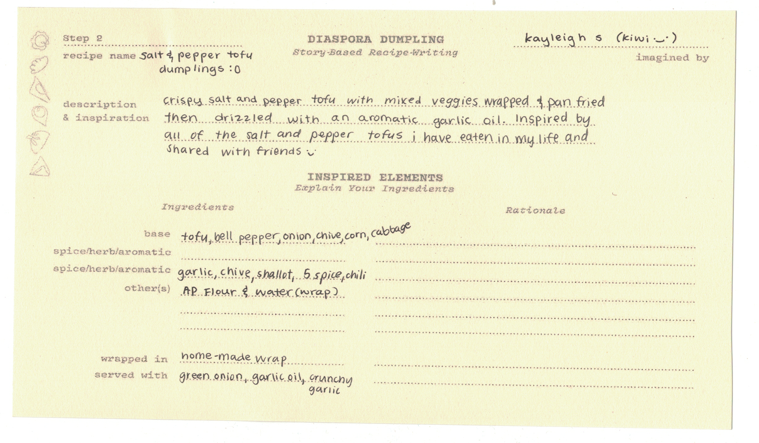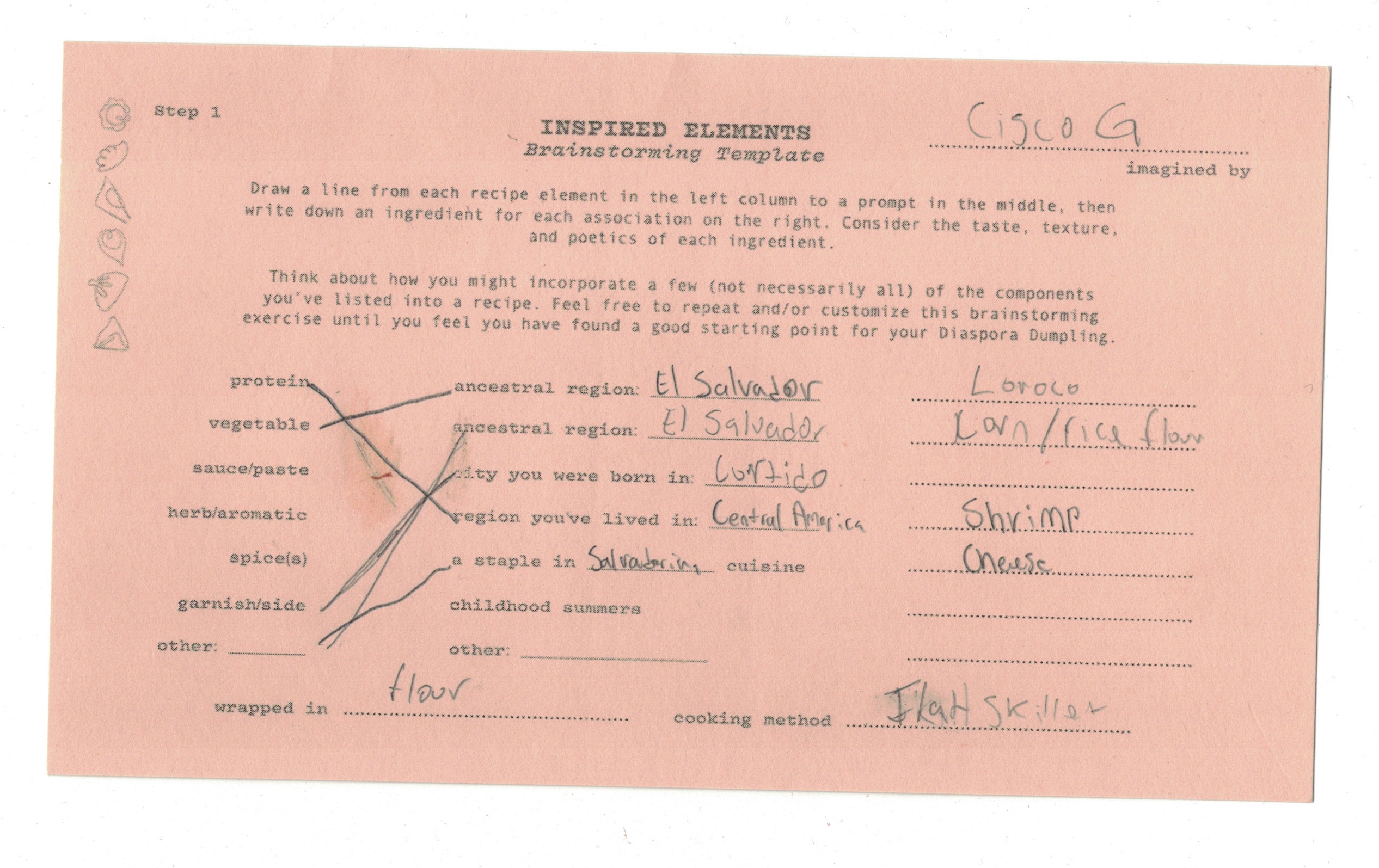 The first additions to the above recipe card collection originate from the Diaspora Dumplings Potluck + Archiving Party, where eight participants shared the edible results of their exploration of the richness of food as medium.