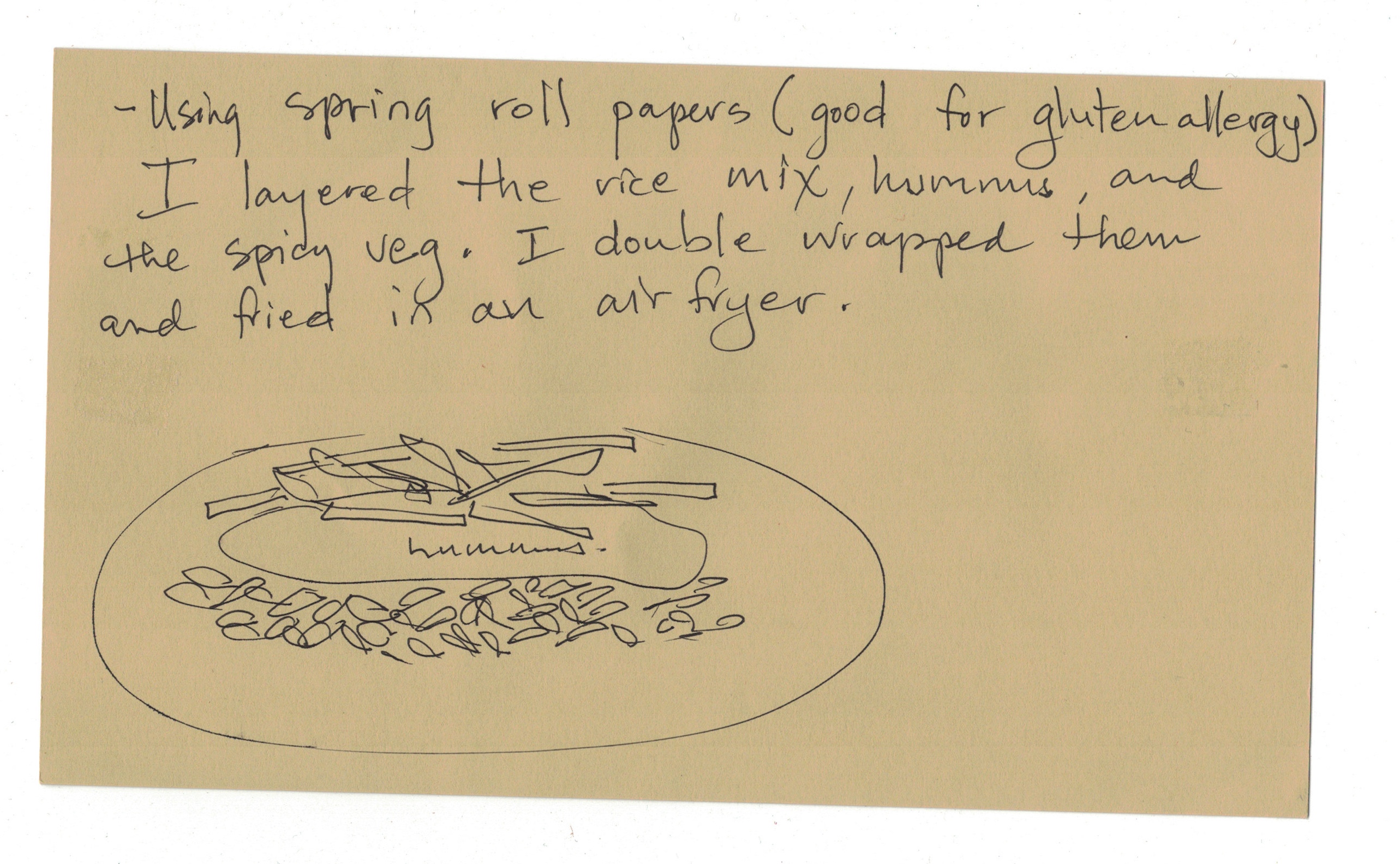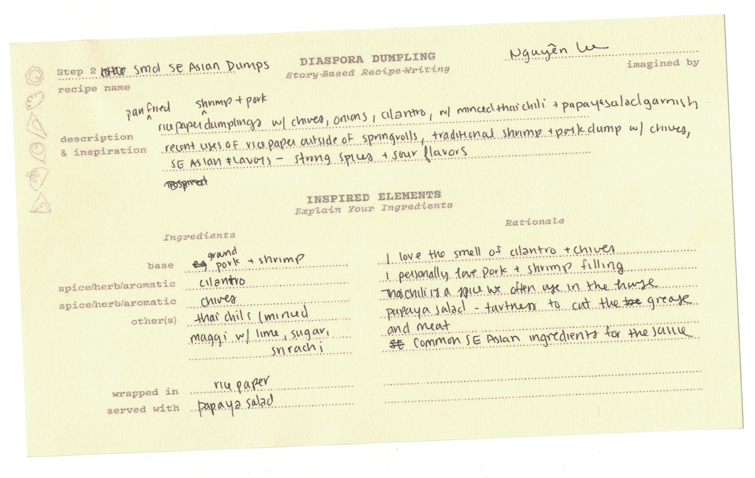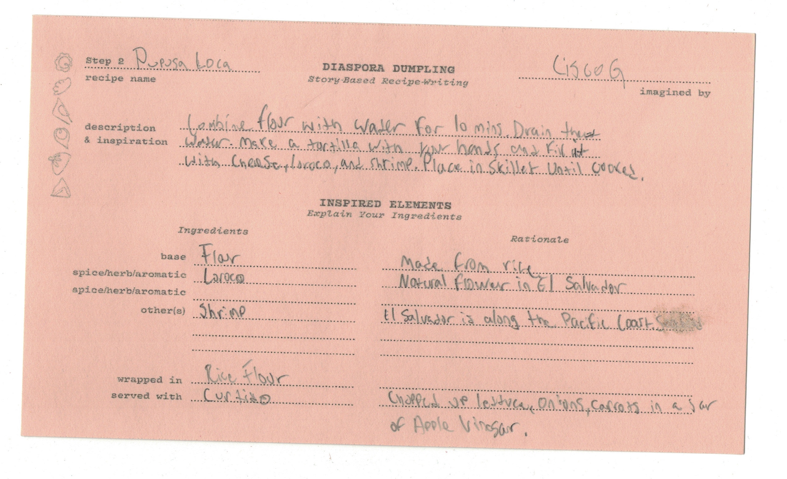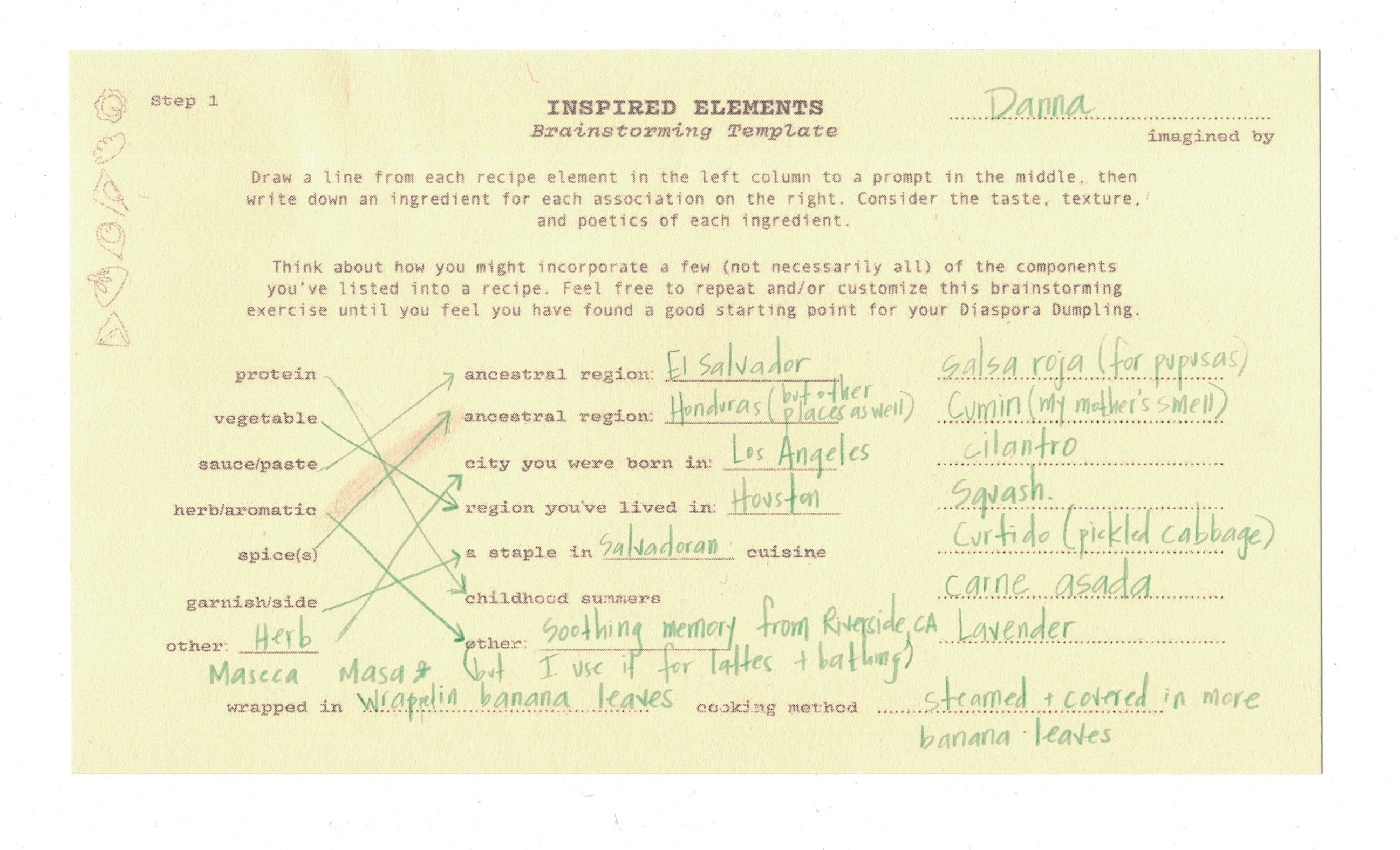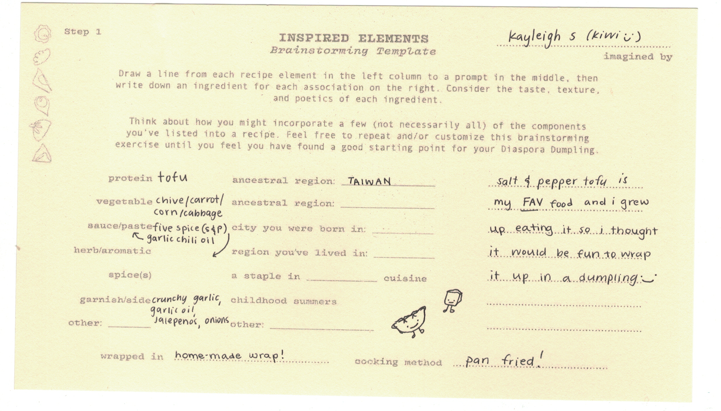 The first additions to the above recipe card collection originate from the Diaspora Dumplings Potluck + Archiving Party, where eight participants shared the edible results of their exploration of the richness of food as medium.
