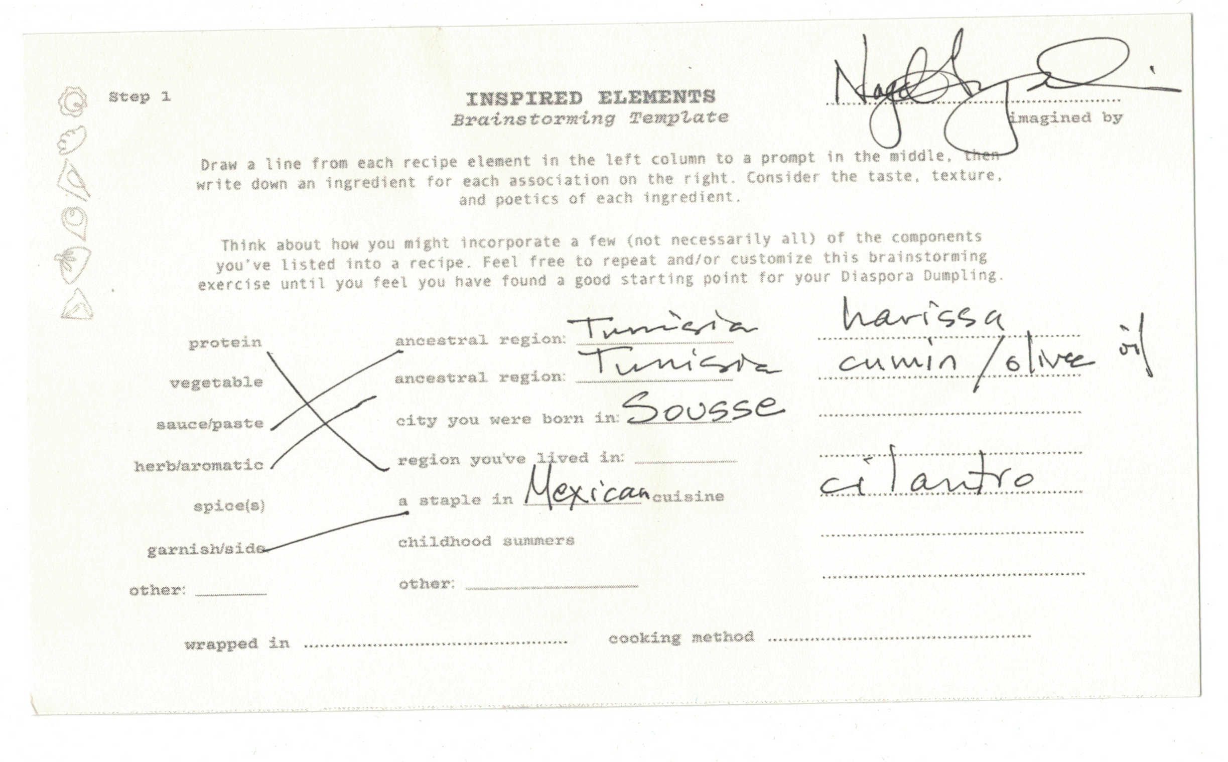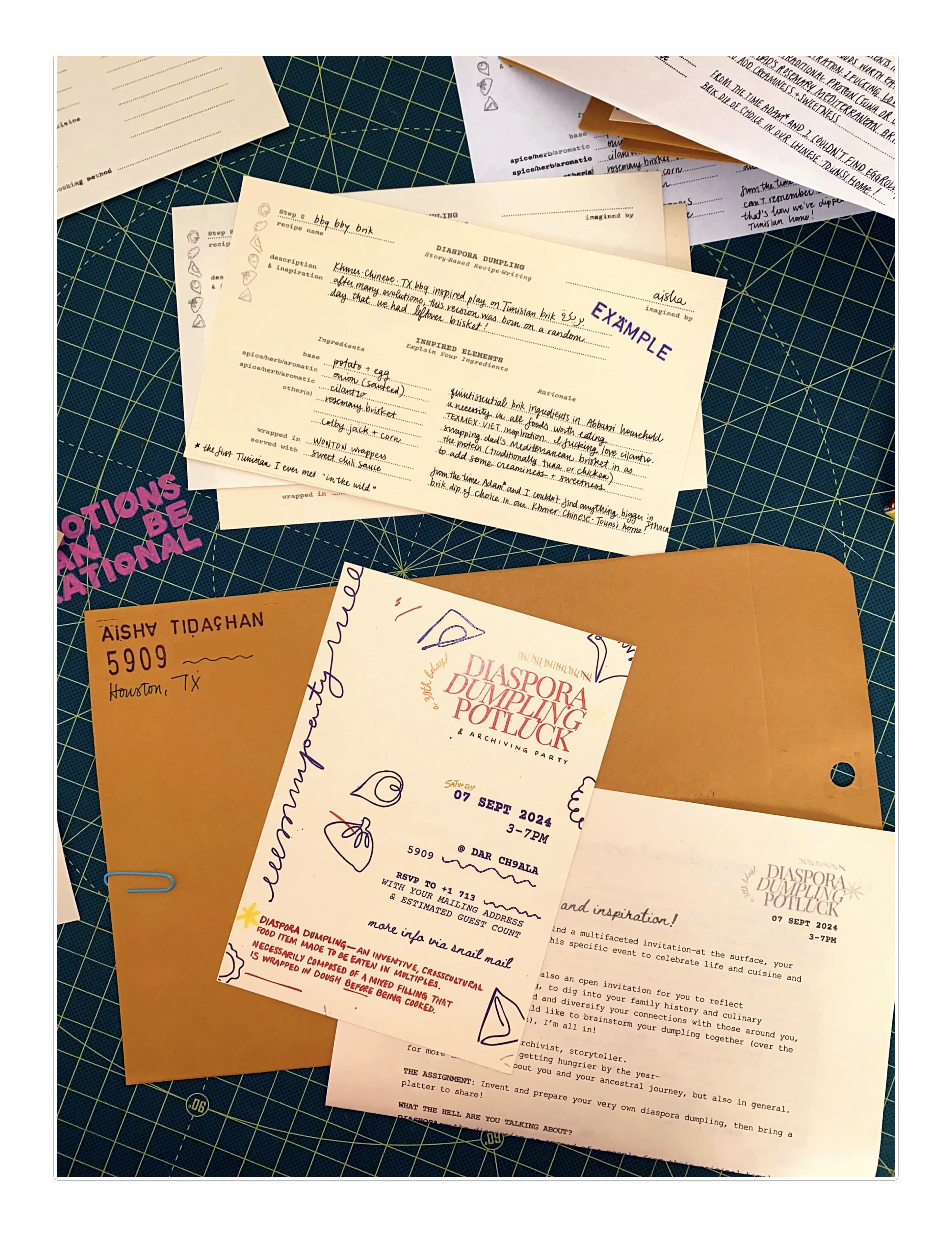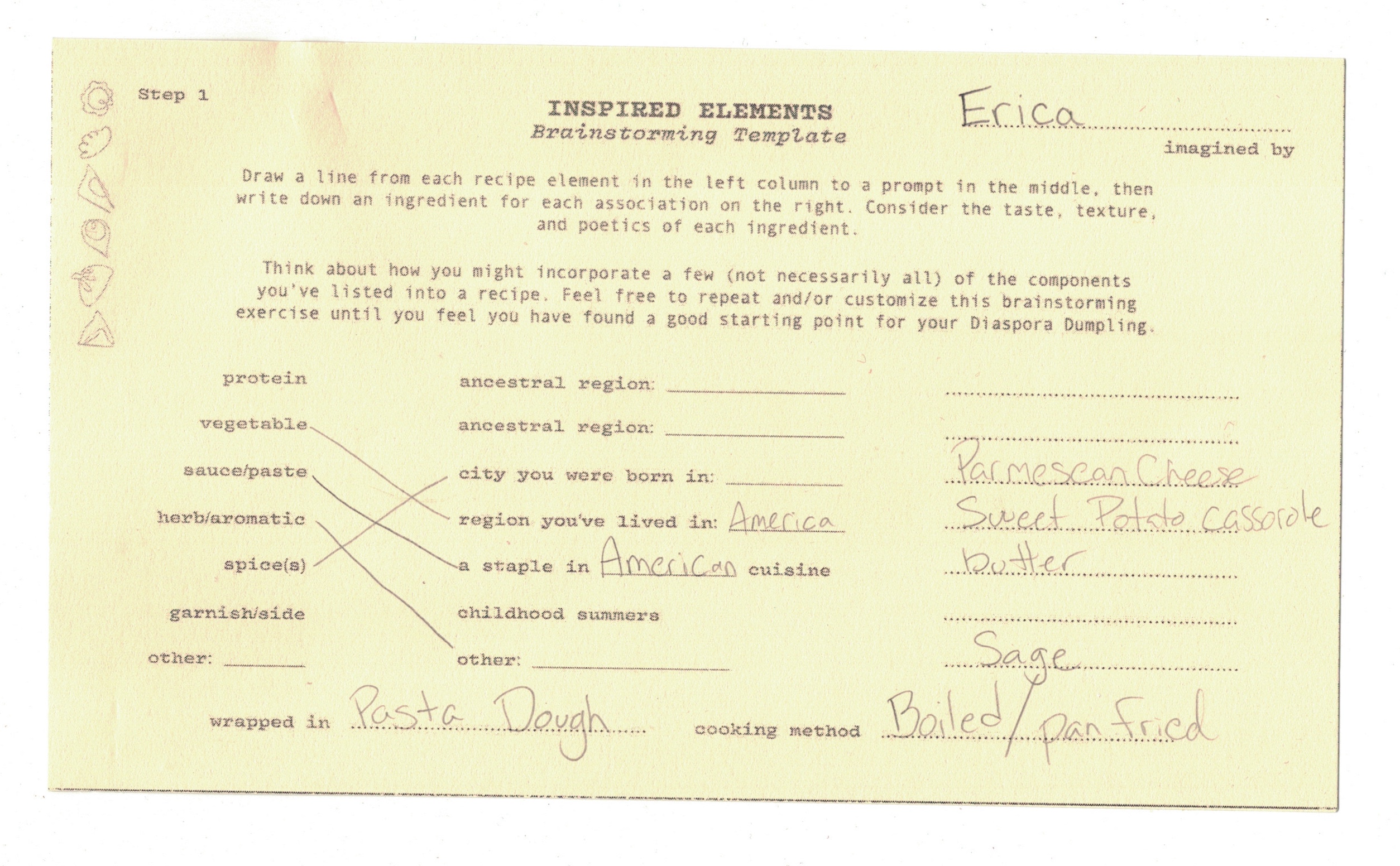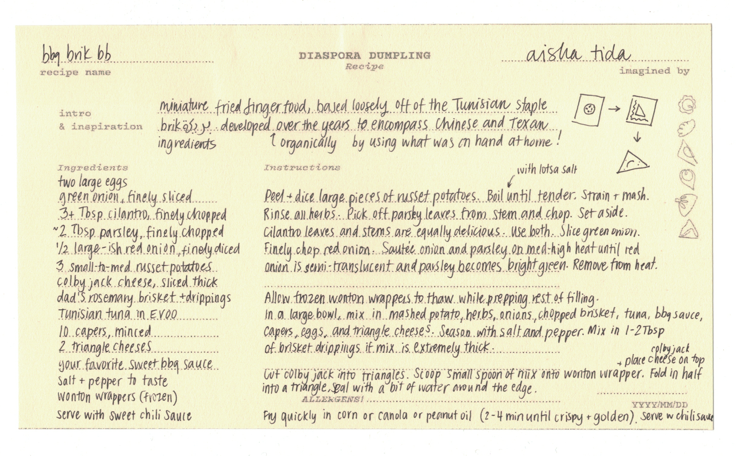 Contact aisha tida for a set of recipe cards. Participation available anywhere reachable by snail mail.Diaspora Dumplings Potluck + Archiving Party